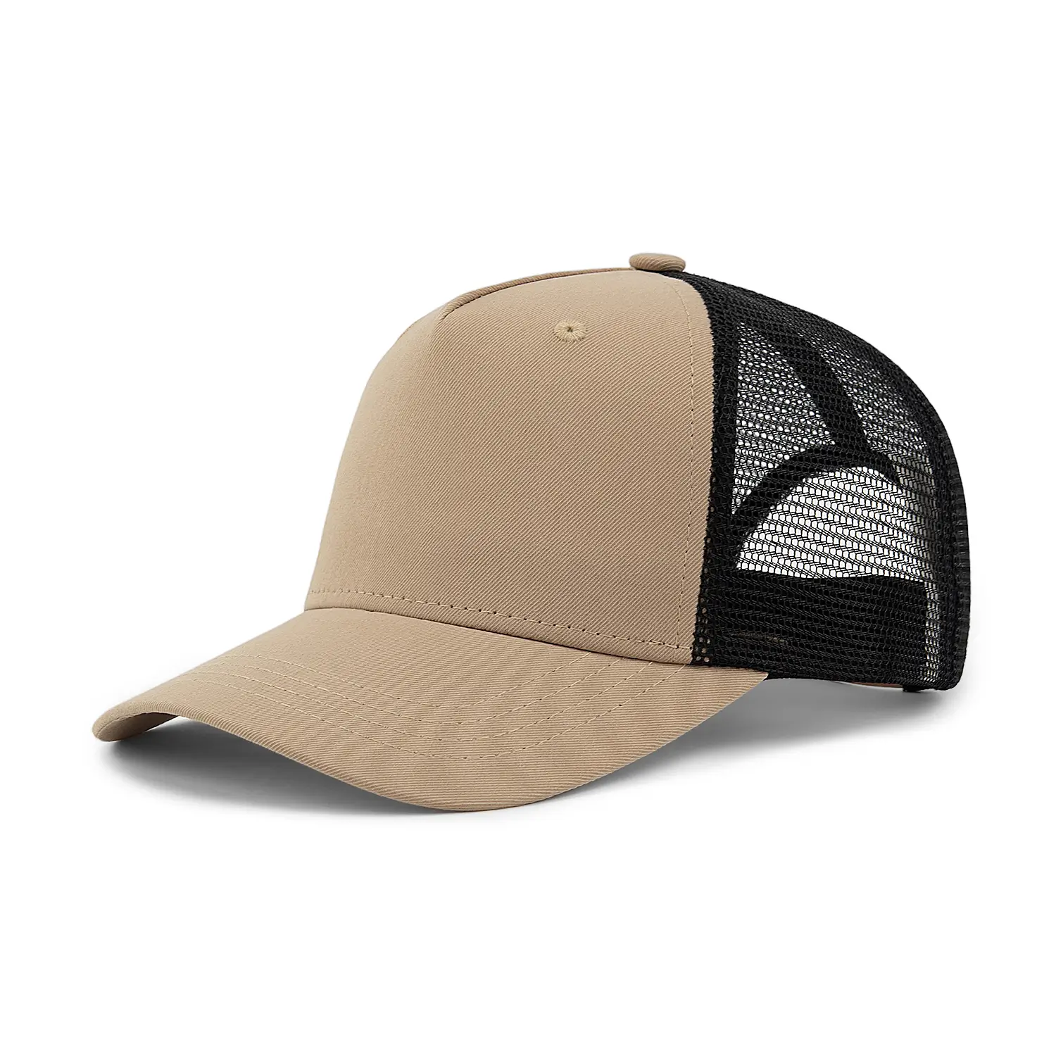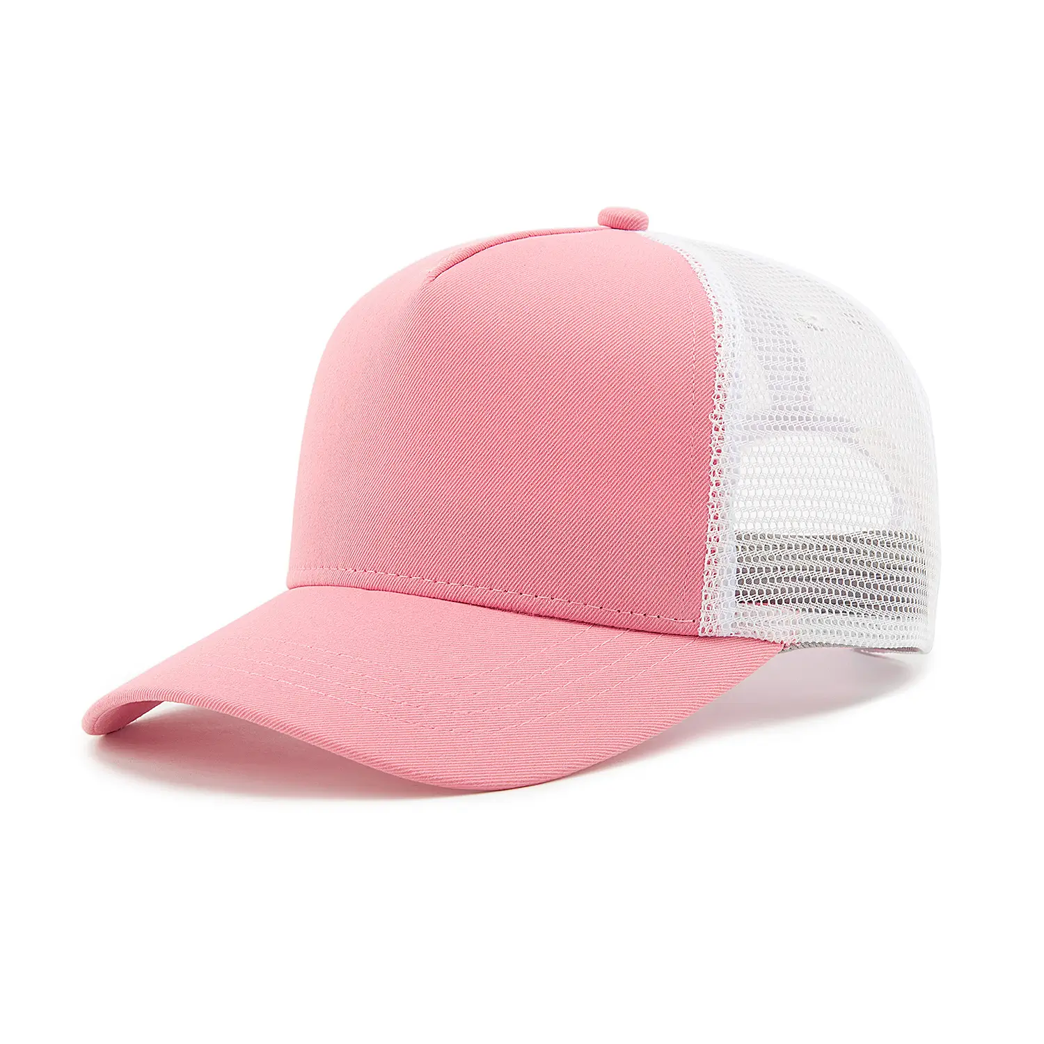 2. Classic 5-panel design: Timeless blank trucker cap silhouette with curved brim and breathable mesh back.