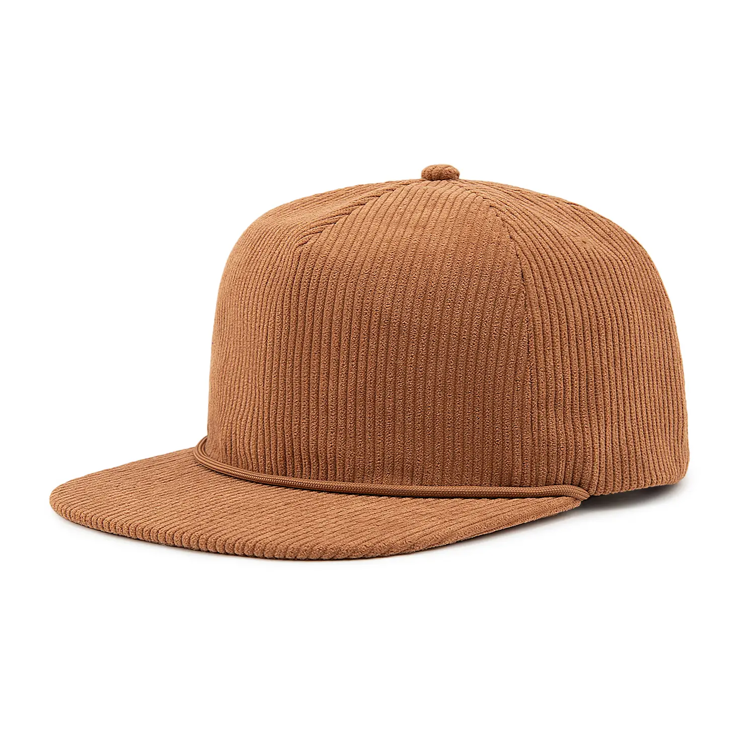 Structure: High-profile, blank, unstructured, 5 panel cap, flat bill with rope